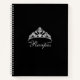 This spiral recipe notebook is shown in sleek Black with a print of a Silver tiara crown on the cover and has great layout for your ease of adding in your own recipes. Beneath the crown is the word recipes in fancy script. Back cover in solid colour of Black with a small same colour crown at bottom.