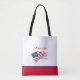 This cute stylish medium tote bag is shown in White with text reading "America" above an American Flag on an angle. A Silver-Grey coloured tiara-crown sits on the American flag. Has bottom strip of Red with Royal/Navy Blue thinner stripe.
