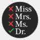 MISS MRS MS DOCTOR funny DR PhD humour Classic Round Sticker