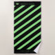 This beach towel is shown in a Black background with bold bright Apple Green colour stripes and with a print of a gleaming Green pageant crowns on opposite ends. Text for you to personalise with your name, pageant title or favourite phrase.
