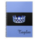 Notebook shown with a photo print of a gleaming Blue coloured crown print on a black background and a personalised name. Notebook shown in Blue. Customise this item and change the name to yours or take off, or purchase as shown.