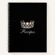 This spiral recipe notebook is shown in sleek Black with a print of a gleaming Silver crown on the cover and has great layout for your ease of adding in your own recipes. Beneath the crown is the word recipes in fancy script. Back cover in solid colour of Black with a small silver crown at bottom.