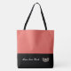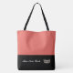 This cute stylish large tote bag is shown in a Salmon [coral] and Black colour block style with a pageant crown and custom text.