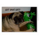 Otis the Pug pleas innocent until proven guilty in the case of the "Missing Cat"...cute pug card for pug & dog lovers. Blank inside.