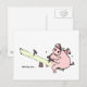 A lonely cartoon pig sitting on a seesaw with no one to play with. This postcard printed with the caption, "Missing you". would be great to send that special someone to tell him/her how much they're missed.