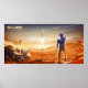 The scientific illustration of a colony on Mars in the near future features the launching mission of the rocket into the atmosphere in one of the colonies