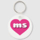 This key chain features a vibrant hot pink heart containing the bold, white, rounded lower case letters ms, a playful abbreviation for Mississippi, the magnolia state.