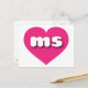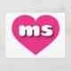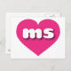 This postcard features a vibrant hot pink heart containing the bold, white, rounded lower case letters ms, a playful abbreviation for Mississippi, the magnolia state. The reverse side of the postcard is blank, awaiting your customised text or handwritten sentiments.