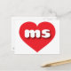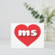 This postcard features a vibrant red heart containing the bold, white, rounded lower case letters ms, a playful abbreviation for Mississippi, the magnolia state. The reverse side of the card is blank, awaiting your customised text or handwritten sentiments.