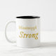 Prominently displayed on the front of the mug is the bold, stylish typography spelling out "Mississippi Strong" in striking golden letters. The use of gold accents adds a touch of luxury and prestige, elevating the mug's visual appeal and making a powerful statement. The choice of font reflects modern design sensibilities, with sleek sans-serif characters that convey a sense of strength and resilience.