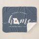 Show some home state pride with this cute rustic blue throw blanket featuring "home" in white calligraphy script lettering with a silhouette map of the state of Missouri standing in for the letter "O." A red heart illustration inside the state map completes the design; you can change the position of the heart to your home city by opening the design tool and dragging the heart shape to your favourite spot. Personalise with your home city, family name and year established to create a perfect and memorable housewarming gift or addition to your new home.