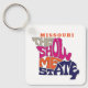 Fun and colourful typographic keychain with a retro feel features the state of Missouri's nickname: "The Show Me State" displayed within a state shaped silhouette