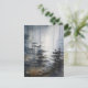 A dreamlike forest scene features tall, slender trees enveloped in a misty, ethereal atmosphere. The subdued colour palette of blues and browns enhances the tranquil and mysterious mood.