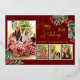 Festive Happy Holidays card with spaces for 4 photos. Tan and green photo frames let the pictures pop from the maroon coloured background. 2 corners have greenery with red berries to add to the festive design. The foil font adds class and gives the card a well rounded touch.