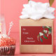 Photograph of a sprig of mistletoe with berries on a cranberry background. All text customisable.
