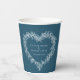 Mistletoe heart wreath drawing blue and white winter wedding party paper cups with your own photo on the reverse. Add your own couples name and wedding date on a dark blue background with white mistletoe heart wreath and white text on one side and photo on the other side. Other colours and matching wedding items available. © Original drawing and design by Sarah Trett for www.mylittleedenweddings.com on Zazzle.