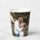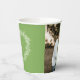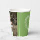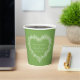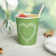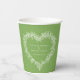 Mistletoe heart wreath drawing green and white winter wedding party paper cups with your own photo on the reverse. Add your own couples name and wedding date on a green background with white mistletoe heart wreath and white text on one side and photo on the other side. Other colours and matching wedding items available. © Original drawing and design by Sarah Trett for www.mylittleedenweddings.com on Zazzle.