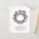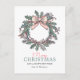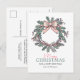 This holiday postcard design features a pastel-coloured wreath with green holly leaves, pink berries, pine sprigs, and a light pink bow at the top, creating a vintage, elegant look. The simple white background allows the wreath to stand out as the central element, giving the card a festive yet understated feel.