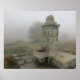 A stone fountain stands alone in a foggy landscape, with a lone tree and a small pool of water nearby.
