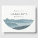 Misty mountains wedding guest book to personalise with names of the bride and groom. Misty mountain range and forest is the image covering the front, with dark grey on the back.