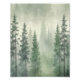 An ethereal and atmospheric digital painting or illustration depicting a dense coniferous forest shrouded in thick mist or fog. The tall, slender pine and evergreen trees create layers of depth, with the foreground trees showing more distinct detail and deeper shades of green, while the trees receding into the background fade into soft, pale, and desaturated hues of sage and grey. The overall mood is calm, mysterious, and tranquil, evoking the feeling of a quiet morning deep in the wilderness.