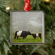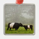 Misty scene of belted galloway cow mothering her metal tree decoration