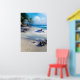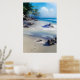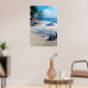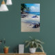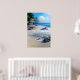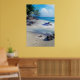 Beautiful watercolor illustration of a misty tropical beach scene with palm trees, rocks, waves ad blue cloudy skies. An AI created fantasy digital art print.