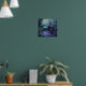This whimsical poster features a witch in a purple hat and cloak, kneels at a moonlit forest pond, her frog like hands stirring glowing water surrounded by lotus and mist.