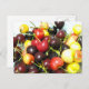 Colourful postcard with a photograph of dark sweet cherries and yellow blushing bing cherries.