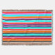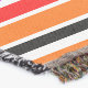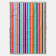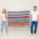This throw blanket has a simple design of vertical stripes of varying thicknesses in red, orange, purple, black, light blue, and white.