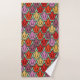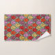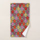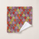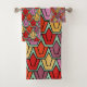 This towel set has an art deco design of tulips from pentagons and trapezoids in orange, red, purple, gold, and green.