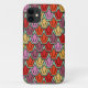 This phone case has an art deco design of tulips from pentagons and trapezoids in orange, red, purple, gold, and green.