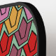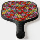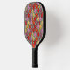 This pickleball paddle has an art deco design of tulips from pentagons and trapezoids in orange, red, purple, gold, and green.