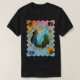 Shape of a stamp and is pink and blue. It has a barcode on the bottom left side and two flowers on the top left and bottom right. In the middle of the stamp, there is an artwork depicting two black cats.
