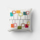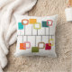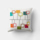 This throw pillow has a mid-century modern design that looks like a mobile with solid and open squares hanging from it in teal, orange, green, red, and beige.