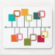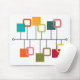 This mouse pad has a mid-century modern design that looks like a mobile with solid and open squares hanging from it in teal, orange, green, red, and beige.