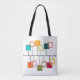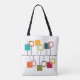 This tote bag has a mid-century modern design that looks like a mobile with solid and open squares hanging from it in teal, orange, green, red, and beige.