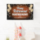 Fun banner sign for indoors or out, featuring festive gold metallic balloons on both sides of the design with sparkly, gold metallic confetti on a rich, warm shade of a mocha brown textured background for your personalised retirement party banner.