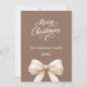 A mocha, muted brown background, cream coloured text and bow. Merry Christmas is written with an elegant hand-lettered style script. Personalise and add your family name.