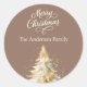 A mocha, muted brown coloured background. Decorated with a snowcovered tree. Merry Christmas is written with an elegant hand-lettered style script. Personalise and add your family name. Cream, beige coloured text.
