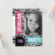 A very modern and stylish black and white zebra pattern design that works well with black and white photographs of your daughter celebrating her sweet sixteenth birthday! High contrast or selective colour photos would also look sharp! This design features bold hot pink and electric blue colour bands, large block letter text and wild zebra print pattern to draw attention to the most important part of the page - your birthday girl! Invite all of her girl friends to a special sweet 16 celebration or any tween or teen birthday party with this pretty feminine, high fashion and trendy card. . It has several easy to customise text areas on the reverse side for your birthday girl's name and all sleepover or celebration party details, as well as rsvp contact information. Click the handy customise button to resize/reposition your photo if necessary and ensure that it covers the entire photo area.