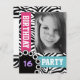 A very modern and stylish black and white zebra pattern design that works well with black and white photographs of your daughter celebrating her sweet sixteenth birthday! High contrast or selective colour photos would also look sharp! This design features bold hot pink and electric blue colour bands, large block letter text and wild zebra print pattern to draw attention to the most important part of the page - your birthday girl! Invite all of her girl friends to a special sweet 16 celebration or any tween or teen birthday party with this pretty feminine, high fashion and trendy card. . It has several easy to customise text areas on the reverse side for your birthday girl's name and all sleepover or celebration party details, as well as rsvp contact information. Click the handy customise button to resize/reposition your photo if necessary and ensure that it covers the entire photo area.
