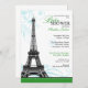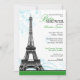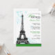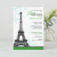 Elegant and modern Parisian Baby Shower invitations with a grey-scale Eiffel Tower atop a green bottom border with aqua blue flourishes behind it.
