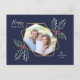 Unique and modern holiday photo postcard featuring a modern geometric (faux) gold foil frame with our watercolor holly berries and leaves.. All text is customisable. Add an additional photo to the back and your custom message.