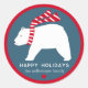 Modern and customisable holiday stickers featuring a festive polar bear wearing a red and white striped scarf on a navy blue background. Editable text boxes for your greeting and name.