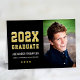 Modern graduation announcement and thank you card features a simple and masculine design with sports jersey inspired lettering, perfect for your all-star student and varsity athlete. Black, gold, and white colours can be completely customised. Include a senior portrait or graduation / party photo.