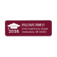 Modern custom address label design features a white grad cap with tassel, class year, return address text and burgundy red background colour that can be customised to match any school or invitation colours.