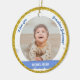 Trendy, elegant, and cute personalised First Christmas Baby Boy Ornament for grandma with a white frame with snowflakes and stars that has a round opening for a custom horizontal photo on the front and back, and a curved blue band on each side on which appears the name of the baby in an elegant script font / typography, and, on the back, another photo and the custom text "First Christmas 202Y" (make sure you personalise the year!). This design includes on the front the words "I love you, Grandma Johanna!", which you can personalise or delete. With a (faux) gold glitter outer frame.