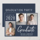 Modern dark blue graduation announcement and party invitation featuring a 3 photo collage, "Graduate" in large white letters and the grad's class year, name and school or university in simple white typography. Add your party details on the reverse side.