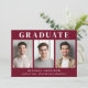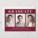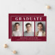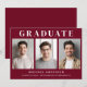 Modern burgundy red graduation announcement featuring 3 photos, "Graduate" in elegant white typography and the grad's name, school and class year in clean white lettering.